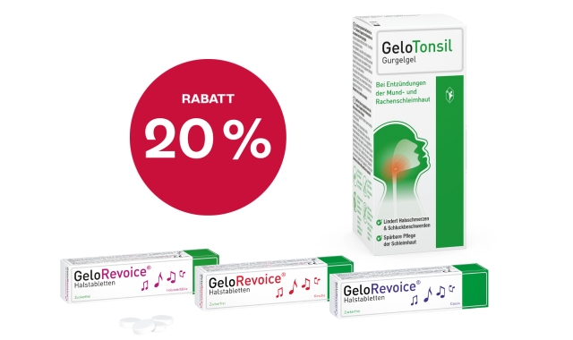Lang anhaltender Schutz für Hals und Stimme – lindert Reizungen und pflegt die Schleimhaut. Jetzt 20 % Rabatt beim Kauf von GeloRevoice Halstabletten und GeloTonsil Gurgelgel.