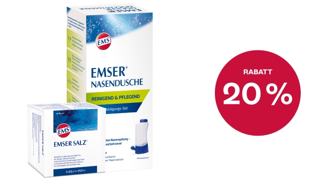 Emser Salz®: Zur Behandlung von akuten und chronischen katarrhalischen Erkrankungen der Nase und Nasennebenhöhlen. Jetzt 20 % Rabatt beim Kauf von Emser® Nasendusche oder Emser Salz®.
